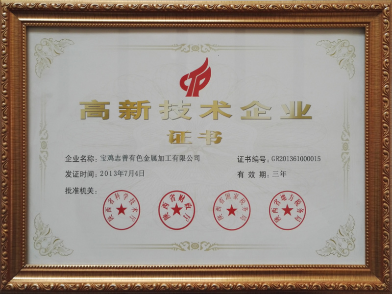 2013年7月,寶雞志普有色金屬加工有限公司被陜西省科學(xué)技術(shù)廳、陜西省財(cái)政廳、陜西省國(guó)家稅務(wù)局、陜西省地方稅務(wù)局聯(lián)合授予高新技術(shù)企業(yè)并頒發(fā)證書(shū)。